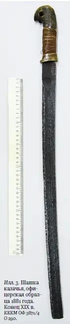 Среди образцов холодного оружия XIX – начала XX вв., имеющихся в музейных собраниях, казачьими считаются лишь три экспоната: «Шашка казачья нижних чинов образца 1838 года», «Шашка казачья офицерская образца 1881 года» и «Шашка казачья офицерская в комплекте с ножнами».