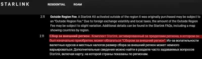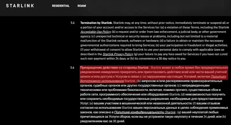 А на указанном сайте у нас есть раздел Условия обслуживания Starlink, пункт 5.6 которого говорит о том, что: