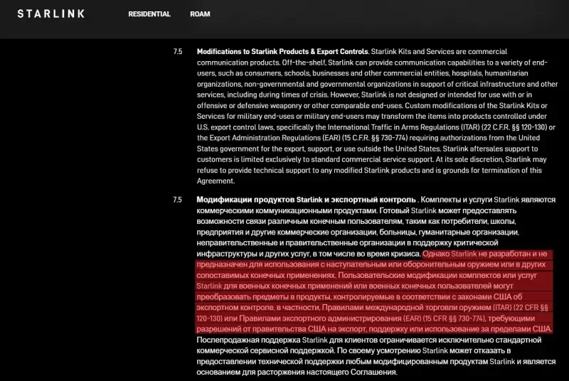 По сути, указанные пункты обязывают пользователя согласовывать с правительством США любое использование оборудования Starlink в составе каких-либо изделий, используемых как оружие.