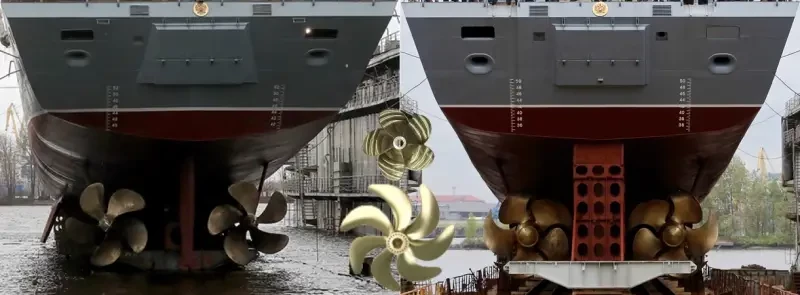 Дальнейшая борьба за увеличение скорости переходила в сферу совершенствования самих винтов, к оптимальному подбору количества и формы лопастей, размеру диаметра винта и его шага, выбору материала и совершенствованию технологий обработки. К сожалению, похоже, что на проектах 1124 и 1124М конструкторы не особо заморачивались всей этой оптимизацией и при наличии на борту 38000 л.с., что давало почти 34 л.с. на тонну полного водоизмещения (как у прокаченного катера), просто втюхивали флоту заказанную максимальную скорость в 36 и 32 узла соответственно проекту.