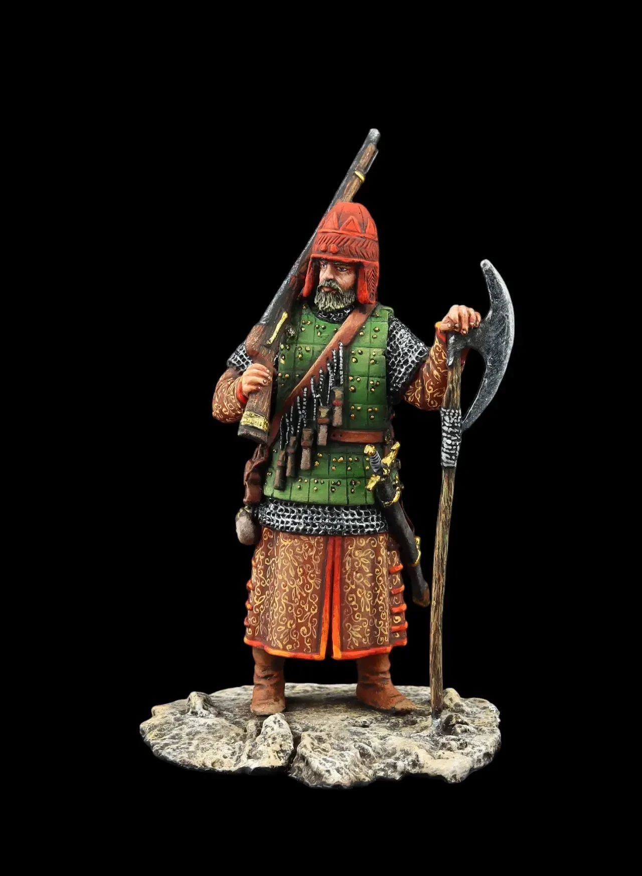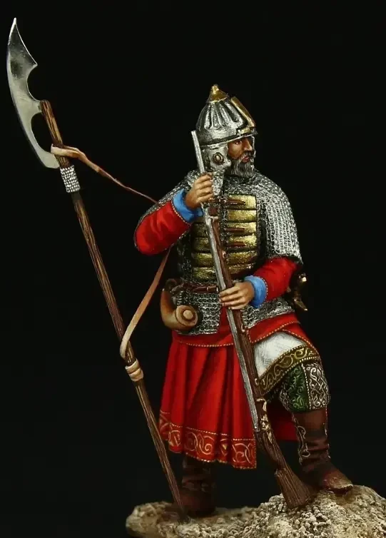 Московский стрелец XVII века, вооруженный фитильным ружьем и топором-бердышом, который он вполне мог использовать в качестве подставки при стрельбе. Правда, в настоящее время все больше пишут о том, что при стрельбе на бердыш стрельцы свое оружие не опирали. Есть и такое мнение, да. Производители: «Silver Dream Studio» и «Георгиевский Крест»