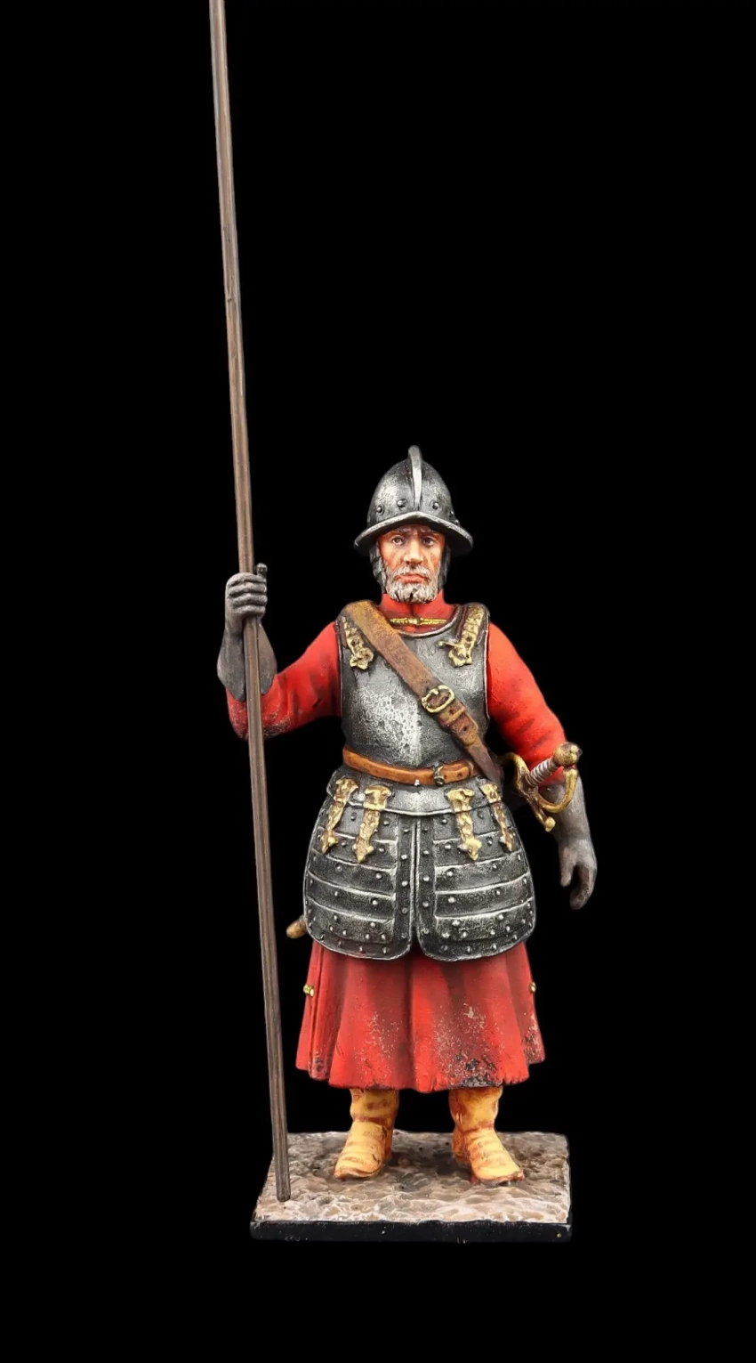 Стрелецкий голова, XVII в. Одежда стрелецкого командного состава отличалась покроем от одежды рядовых, больше походила на охабень и подпоясывалась цветным кушаком. Производители: «Silver Dream Studio» и «EK Castings».