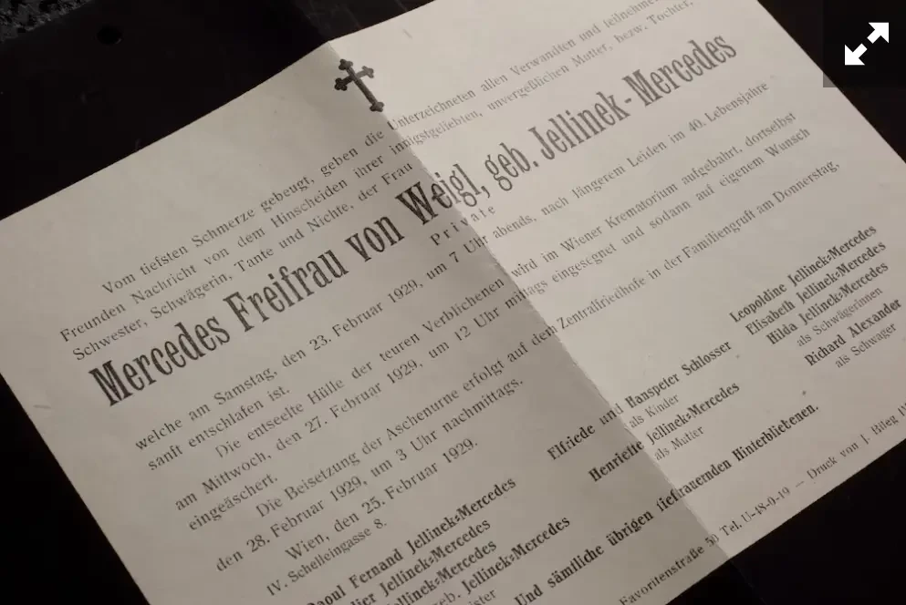 Сообщение о смерти Mercédès. Несмотря на то, что только в 1903 году, когда Mercédès было уже 14 лет, отец Эмиль официально изменил свою фамилию на «Еллинек-Мерседес», а дочь переименовал в Мерседес Еллинек-Мерседес, в некрологе написано «урождённая Еллинек-Мерседес».