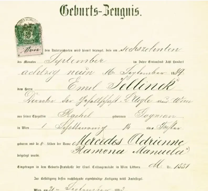 До этой находки ходили слухи, что именем Mercédès девочку называли только дома, а историю с самим этим именем придумал Емиль Еллинек, опять же, для рекламы. Но нет, после найденного свидетельства о рождении девочки стало ясно, она действительно носила имя Mercédès Adrienne Ramona Manuela, родившаяся 16 сентября 1889.