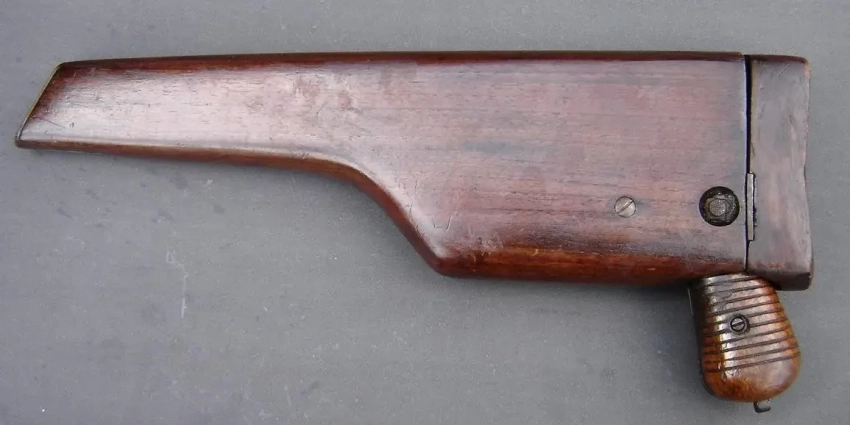 Вот так она прикреплялась к рукоятке, что позволяло стрелку из него более уверенным образом использовать это оружие для стрельбы на большое расстояние и вести огонь очередями