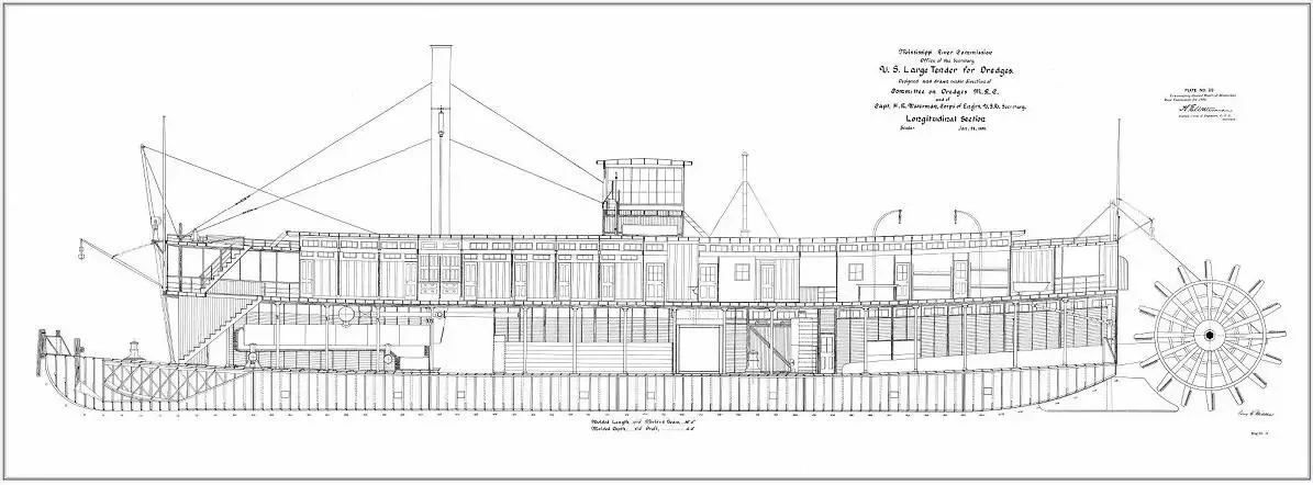 Пока же давайте рассмотрим устройство этих необычных судов. Хотя мы уже рассказывали о них, используя отрывки из книг Марка Твена и Майн Рида, есть смысл обратиться к… чертежам и посмотреть на них не только снаружи, но и изнутри.