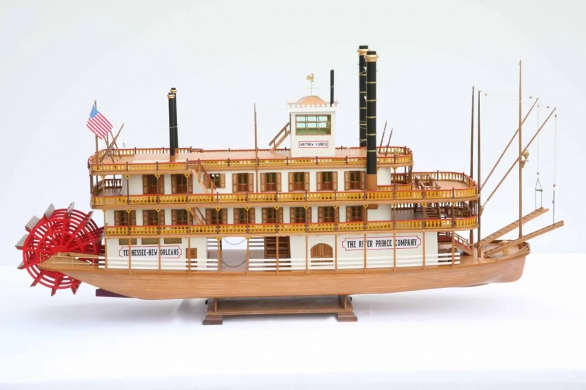 А вот это сборная модель «парохода Тома Сойера» из детевянных деталей одной из итальянских фирм, явно выпущенная на основе чертежей из польского журнала. И вроде бы все хорошо, но… погиб корпуса есть, но где соответствующая погибь палуб, причем как продольная, так и поперечная? То есть, упрощена она до предела, достаточно сравнить ее с тем же пароходом «Мариевилль»…
