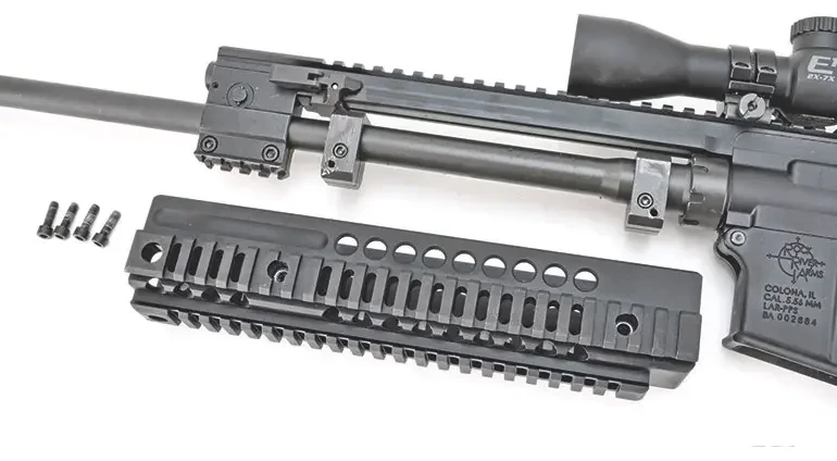 Цевье на LAR-PDS с тремя планками Пикатинни. Цевье крепится с помощью больших шестигранных винтов к блокам, которые прикреплены к стволу между корпусом поршня и камерой. Это необычная система, но она, похоже, нисколько не снижает точности.