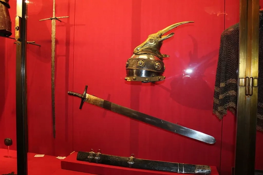 Шлем и меч Скандербега, музей искусств, Вена. Обратите внимание, что шлем украшает голова горной козы, молоком которой он питался, будучи блокирован на вершине бесплодной горы