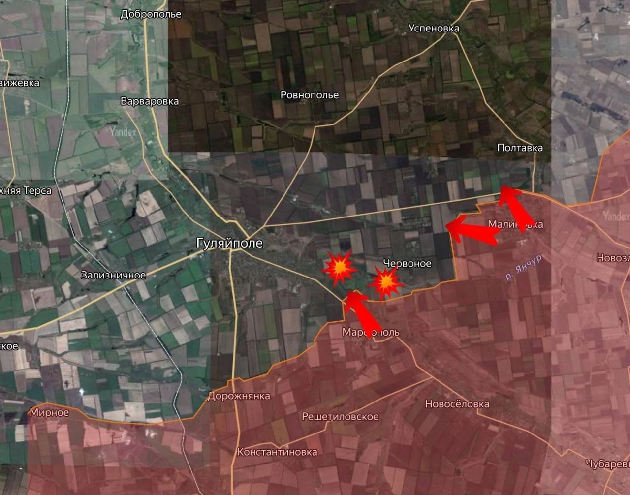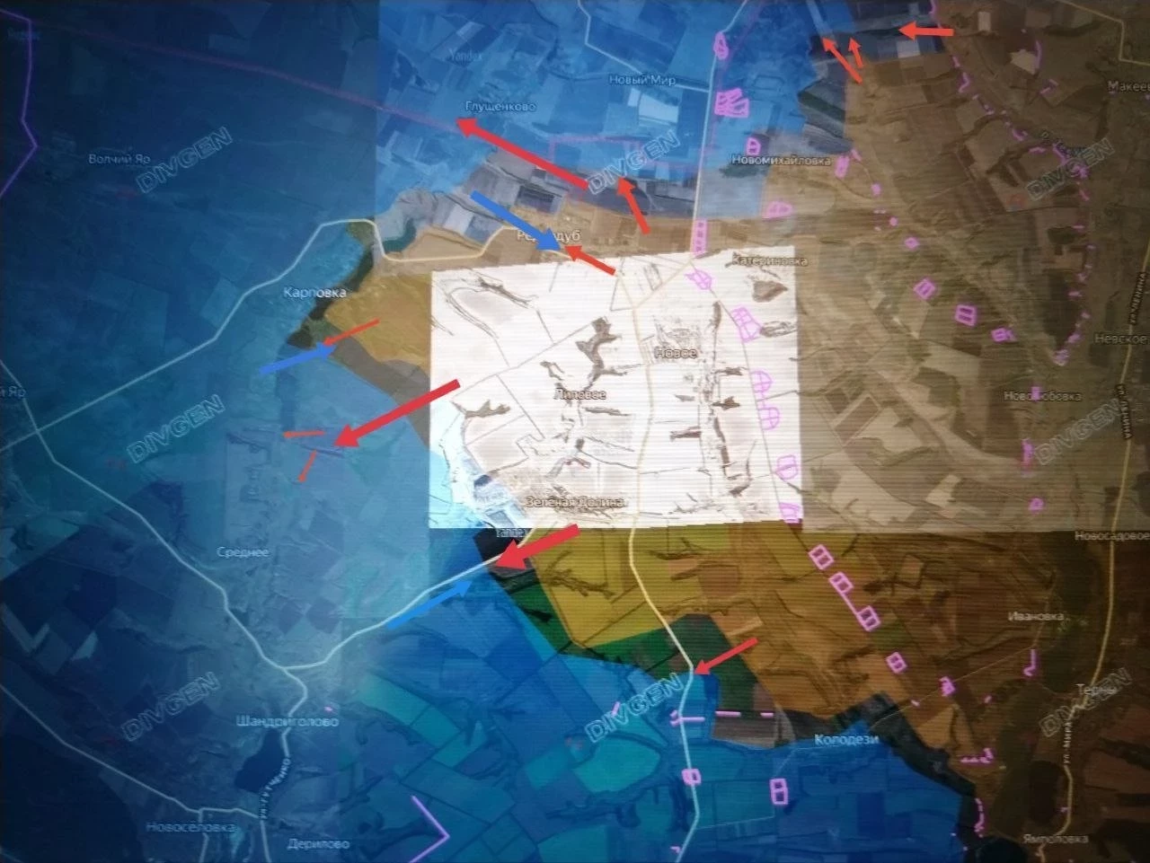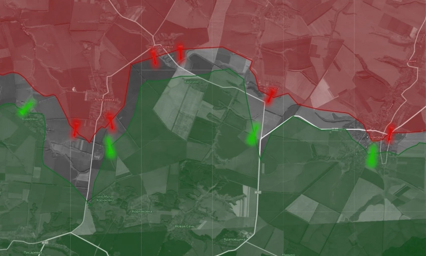 По данным Deep State, российские войска продвинулись ближе к границам Днепропетровской области на двух направлениях. От Мирного - в сторону Воскресенки, а также был зафиксирован заход в Зелёный Гай.