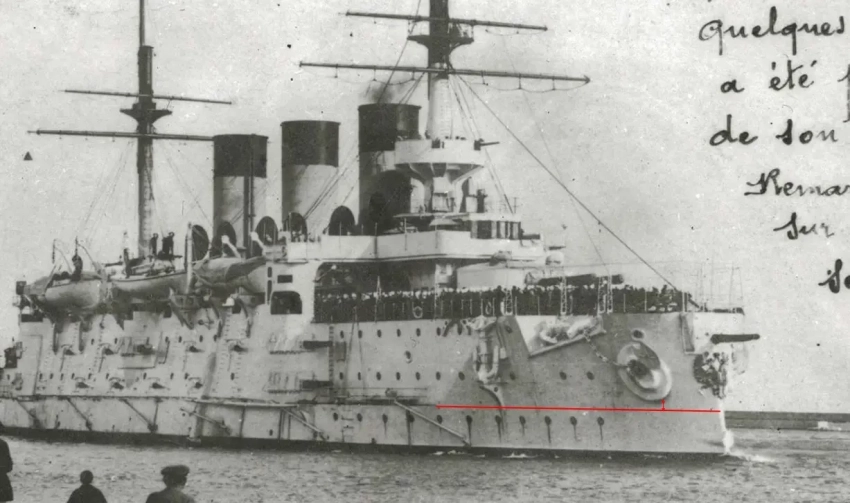 Очевидно, это выражение означает наличие у «Осляби» такого дифферента, при котором нижняя кромка клюзов приблизилась к воде. Согласно фотографиям и схемам «Осляби», хорошо видно, что эта кромка клюзов располагалась от силы в нескольких десятках сантиметров над батарейной палубой эскадренного броненосца. Обратимся хотя бы к фото, выбранному мною для заставки данной статьи.