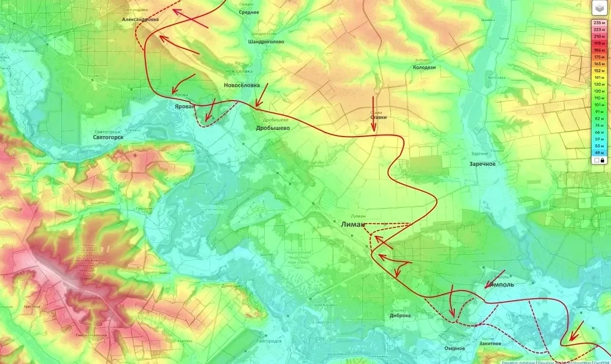На Лиманском направлении после потери ключевых высот в районе населенного пункта Ставки противник начал откат от Заречного к Лиману. Удерживать позиции в низинах под огнем наших дронов бессмысленно. Ожидается штурм Лимана с юга и юго-востока.