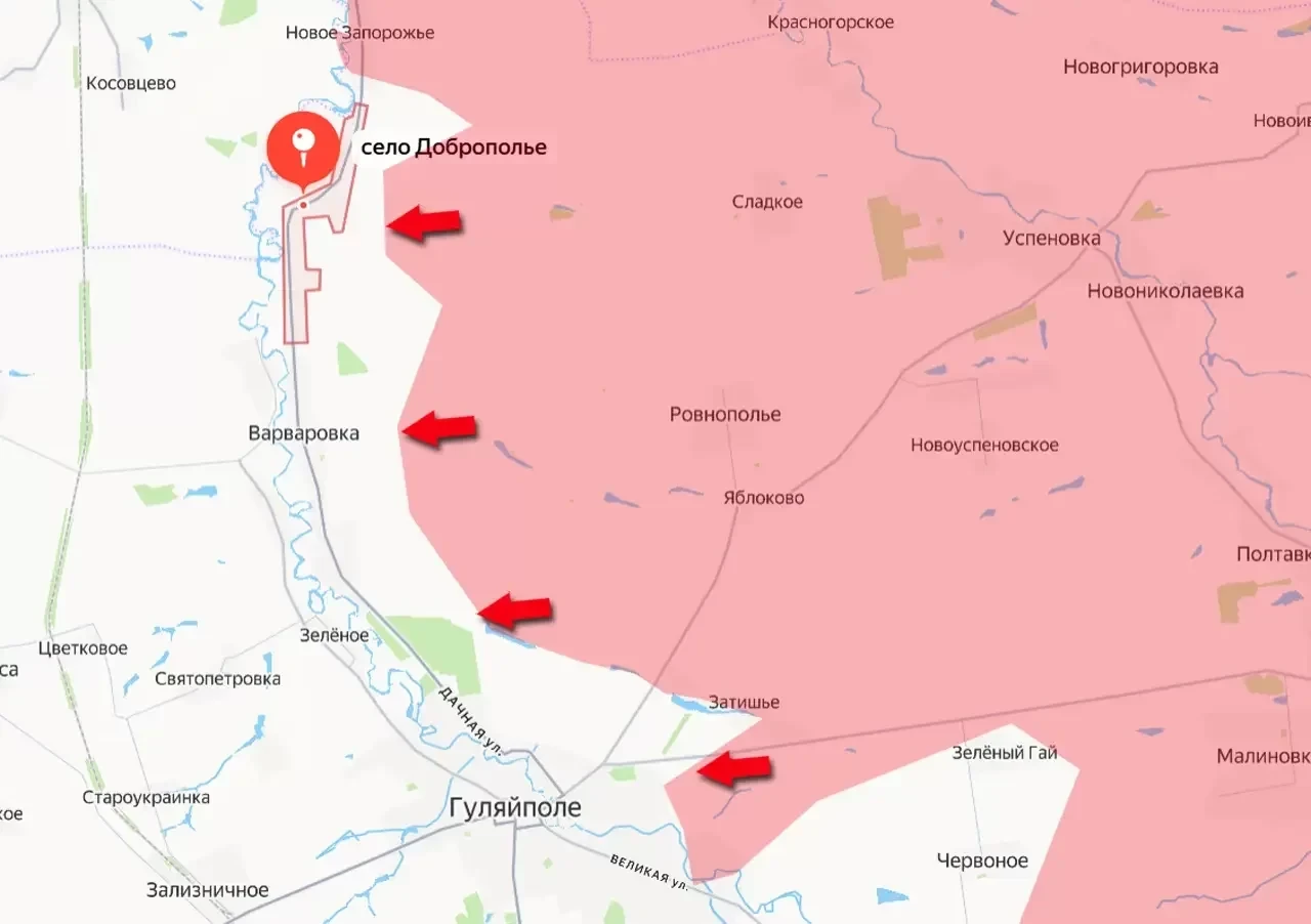 Российские войска с начала суток перевели под свой контроль внушительную по площади территорию в районе Гуляйполя. Выйдя к населённому пункту Доброполье, что неподалёку от границы с Днепропетровской областью, ВС РФ расширили территорию контроля примерно на 20 квадратных километров.