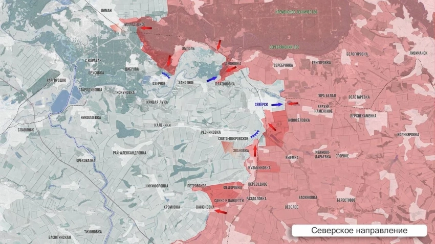 ▪️На Северском направлении идут упорные бои в районе Звановки и Свято-Покровского южнее Северска, где идут логистические маршруты врага. Со стороны Васюковки ВС РФ развивают наступление на запад в сторону Никифоровки и Рай-Александровки. В самом Северске встречные бои в центральной части. В районе Ямполя наши войска зачищают опорники и территорию по флангам от села, а также стараются выбить ВСУ с его позиций в районе перекрёстка с дорогой Красный Лиман - Северск.