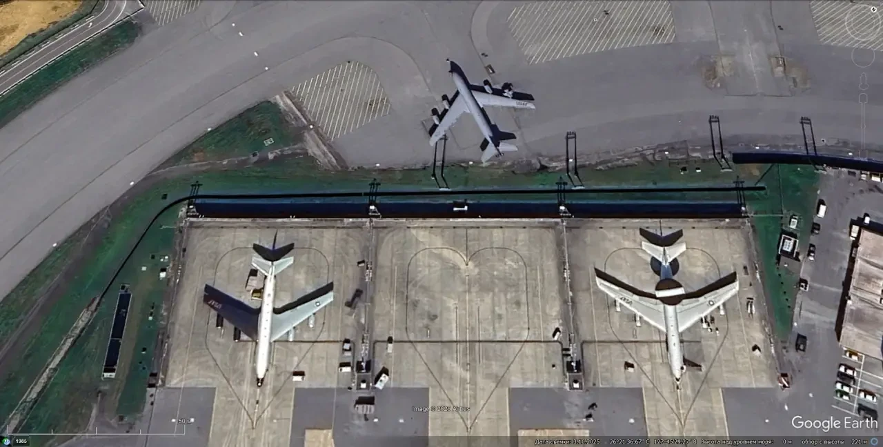 Спутниковый снимок Google Earth: самолёт ДРЛО Boeing E-3G Sentry и самолёты-заправщики Boeing KC-135 на авиабазе Милденхолл в Великобритании. Снимок сделан в июне 2022 года