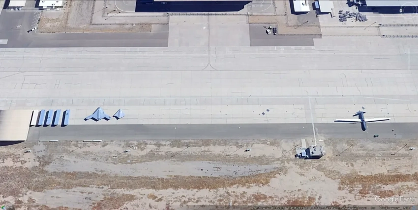 Спутниковый снимок Google Earth: БПЛА Lockheed Martin RQ-170 Sentinel и бомбардировщик Northrop Grumman B-2A Spirit на предприятии Lockheed Martin в Палмдейле