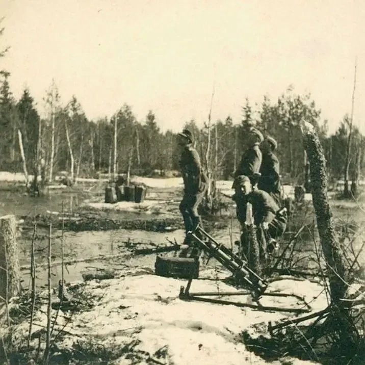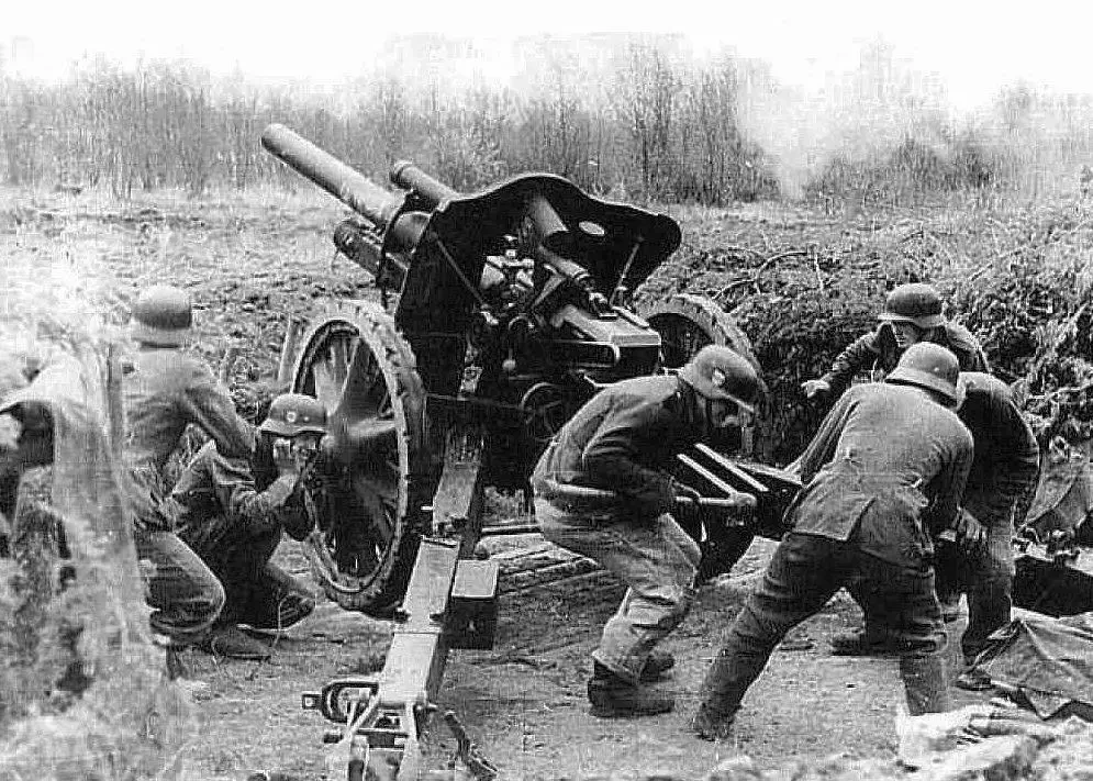 Немецкие солдаты ведут огонь из лёгкой полевой гаубицы le.F.H.18 (из такой гаубицы стреляли 105-мм агитационными снарядами)