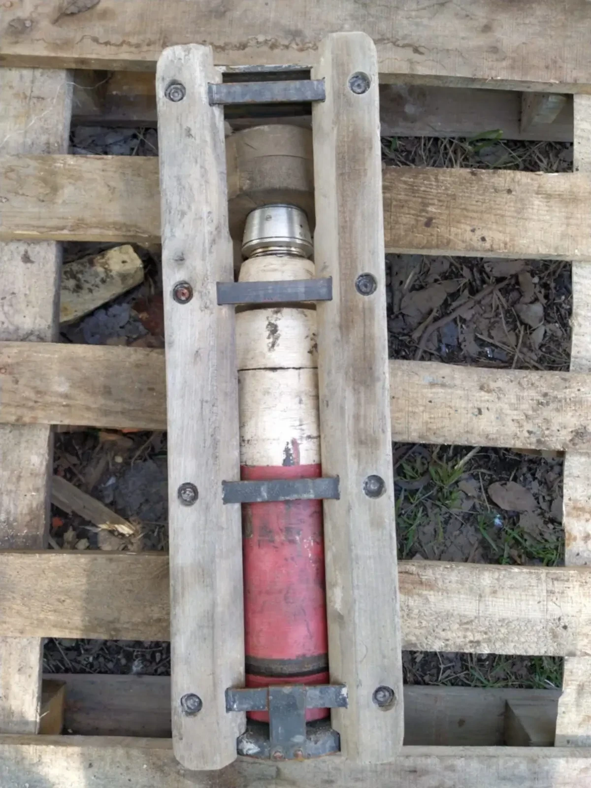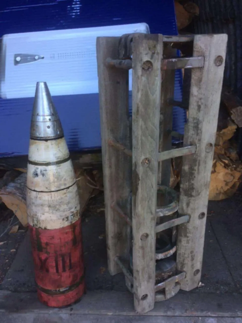 105-мм агитационный снаряд рядом с деревянным лотком, в котором данные снаряды транспортировались
