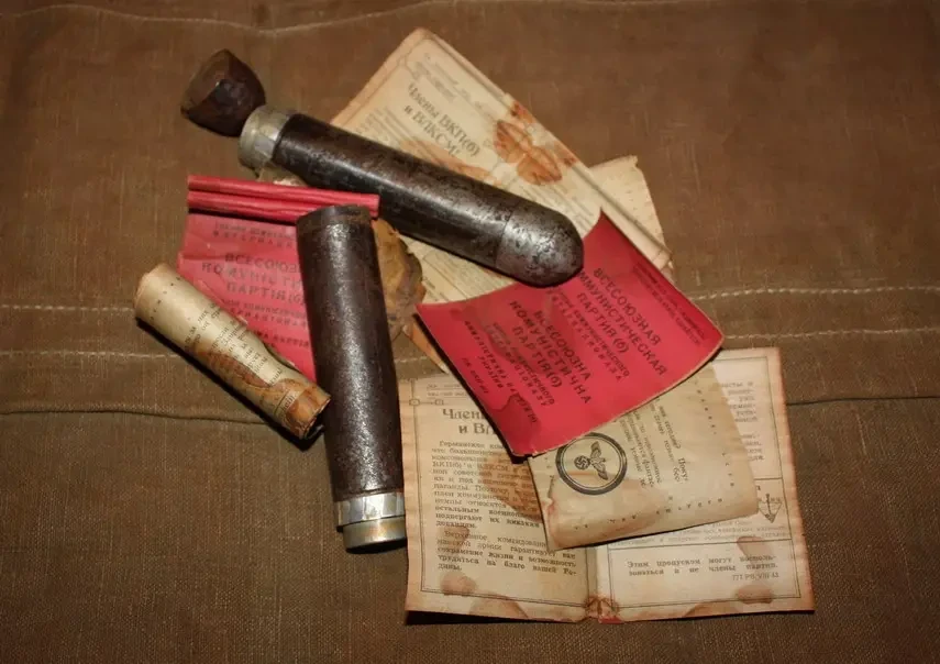 Листовки, замаскированные под партийный билет ВКП(б), извлечённые из агитационной гранаты