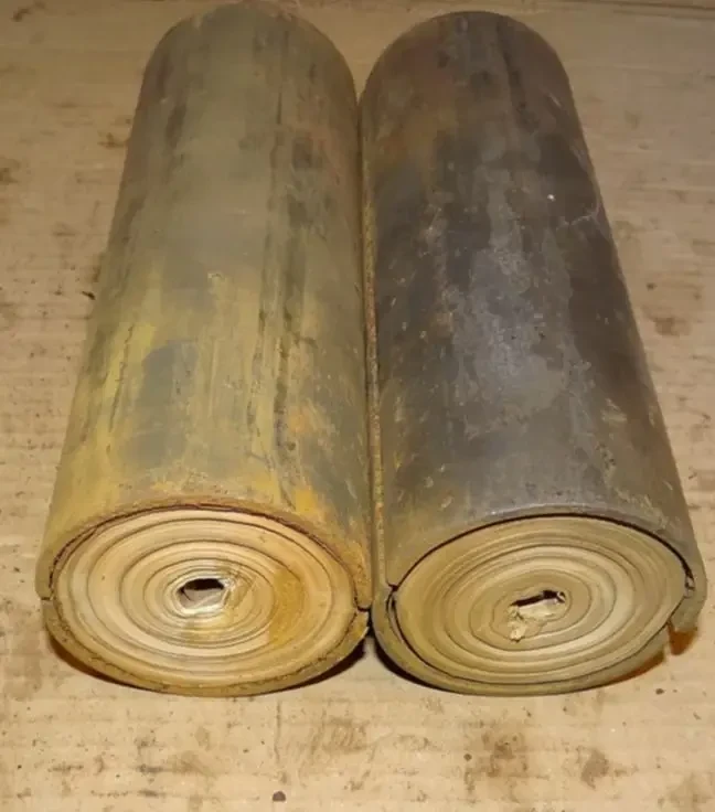 Рулоны листовок, извлечённые из двух 105-мм агитационных снарядов (зажаты между двумя полуцилиндрами)