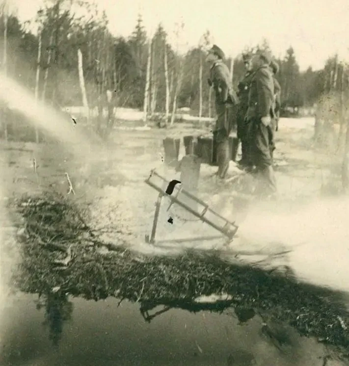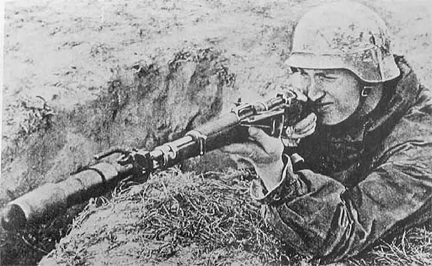 Немецкий солдат готовится к запуску 73-мм реактивной агитационной гранаты