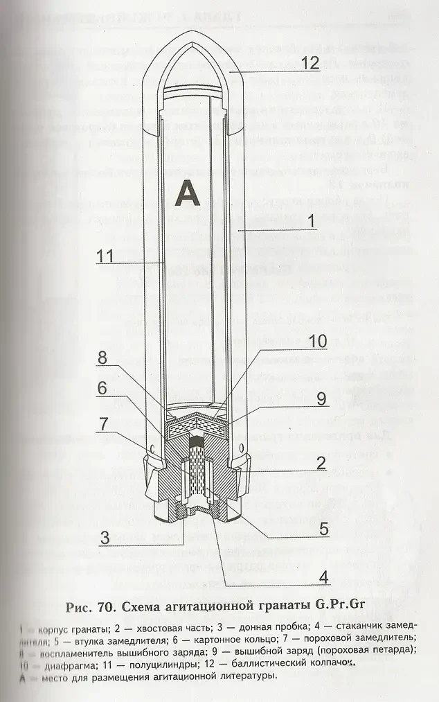 Агитационная граната – это особый боеприпас дистанционного действия. Граната состоит из корпуса, донной части и крышки сверху. Внутри корпуса располагался рулон из 40 листовок размером 90х150 мм. Внизу гранаты также располагался вышибной заряд из чёрного пороха.