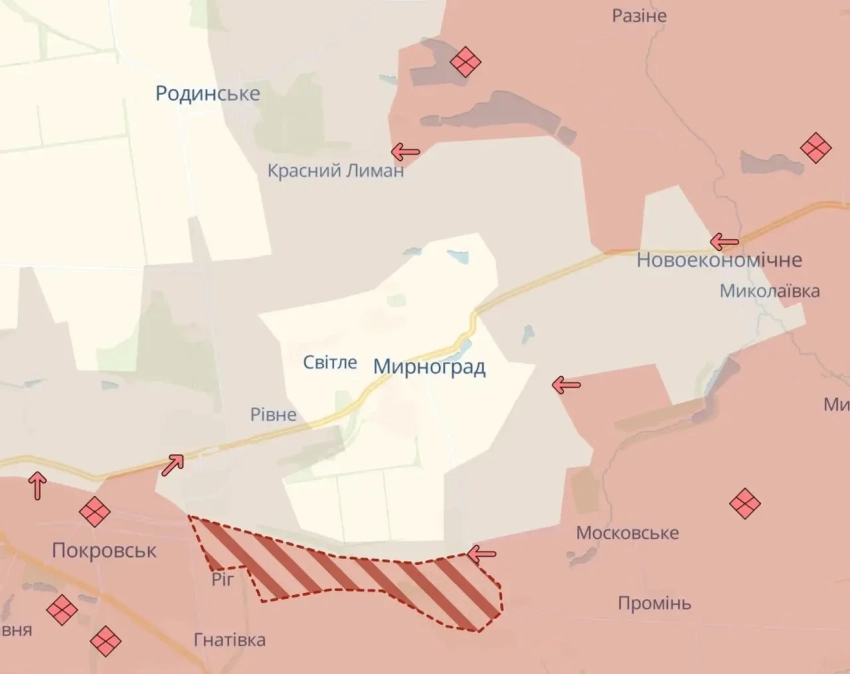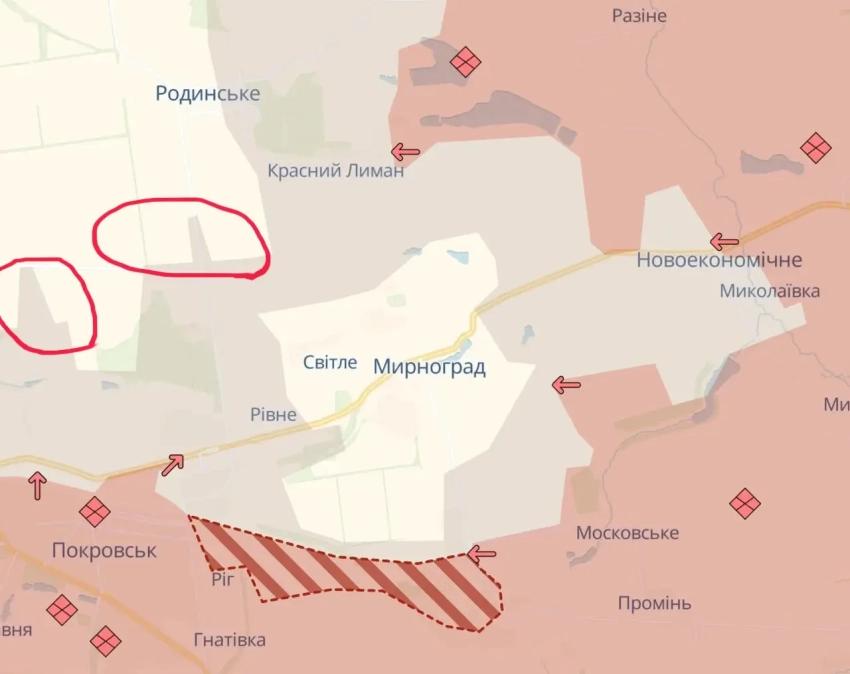 На самом деле, объяснение этому предельно простое. Когда ВСУ в последнее время теряют один населённый пункт за другим, приходится выдумывать такие фронтовые конфигурации, которые оставляли бы шанс для «громадян» считать, что на самом деле всё не так плохо. Мол, и русских никаких в том же Мирнограде нет. А кто есть? А есть украинский гарнизон, опоясанный серой зоной. А если серой зоной, то как бы есть и «все шансы на локальный успех».