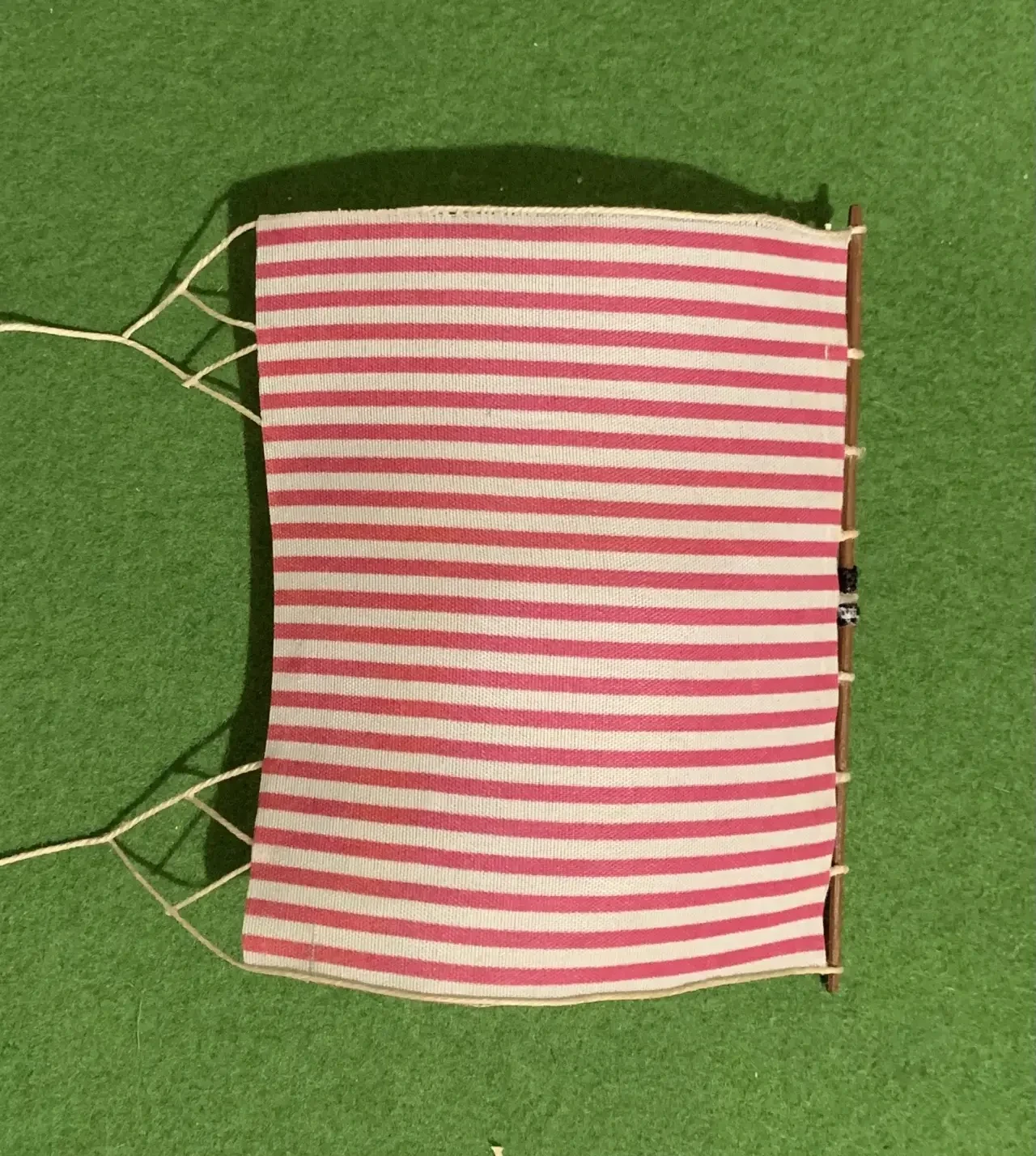Парус из полосатой ткани, привязывается к рею, после чего пропитывается клеем ПВА и высушивается феном в положении «наполненного ветром»… Фотография автора