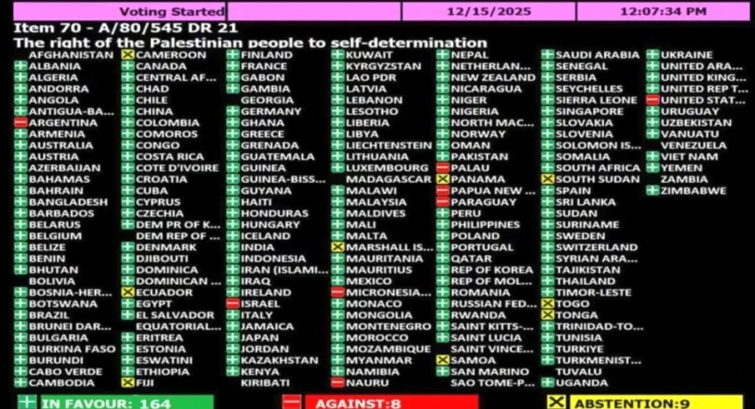 В Нью-Йорке состоялось очередное заседание Генеральной ассамблеи Организации Объединенных Наций, на котором рассматривался вопрос о праве палестинского народа на самоопределение и создание независимого государства Палестина. Соответствующая резолюция была принята большинством голосов. За нее проголосовали 164 страны, восемь выступили против.