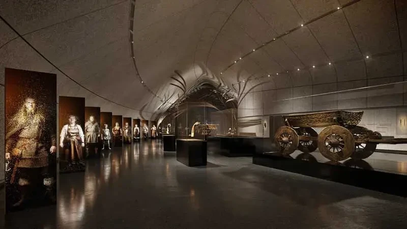 Более того, здание старого музея кораблей викингов решили заменить на новое, более просторное и удобное, и разместить самые впечатляющие корабли там. Сделать это было непросто, хотя расстояние до нового здания было невелико – всего-то около 100 метров. И, тем не менее, это была сложная инженерная операция. Из-за хрупкости кораблей обращаться с ними нужно было исключительно осторожно, особенно с более тяжелым и менее прочным гокстадским кораблем. Так, «Осеберг» более двух лет был заключён в стальной каркас весом более 50 тонн, что позволило ему оставаться на месте в течение всего времени строительства нового здания музея. Переместили корабль на новое место в сентябре 2025 года, причем передвигался каркас с кораблем по рельсу, укрепленному под потолком, очень медленно, со скоростью всего 30 см в 5,5 минут, то есть ехал он к новому месту пребывания целых 10 часов.