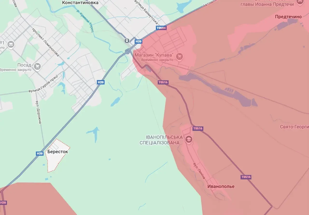 По состоянию на данный момент российские войска взяли под контроль Берестокскую автодорожную развязку, подойдя на близкую дистанцию к селу, по которому она и была названа. Это село Бересток, находящееся всего в 1,3 км от южных окраин Константиновки.