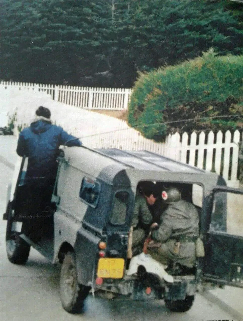 Мы находились на последнем участке дороги в Стэнли. Из одного из трёх белых домов, примерно в 500 метрах от нас выстрелил пулемёт и попал в правый бронетранспортёр Amtrac. Огонь был очень точным. Затем раздались выстрелы из гранатомёта, но они были не точными, снаряды упали далеко от нас. Мы следовали стандартной процедуре и предприняли маневр уклонения. Первый бронетранспортёр Amtrac открыл ответный огонь и укрылся в небольшой низине. Как только он оказался вне опасности, я приказал всем трём машинам высадить людей. Я приказал расчёту безоткатного орудия (на вооружении десанта были 75-мм безоткатные орудия – Г. Т.) выстрелить одним кумулятивным снарядом в конёк крыши дома, где находился пулемёт, чтобы вызвать взрыв, но не хлопок. Мы по-прежнему следовали приказу не наносить потери. Первый снаряд дал недолёт в сто метров, но второй попал в крышу. Затем британские войска бросили фиолетовую дымовую гранату; я подумал, что это их сигнал к отступлению. Они прекратили стрельбу, поэтому капитан 2 ранга Вайнштабль начал продвижение двух рот вокруг позиции. Из одного из домов несколько стрелков открыли огонь; это было довольно неприятно. Я не мог точно определить и местоположение, но один из моих амтраков смог и попросил разрешения открыть огонь из миномёта, который на нём стоял. Я дал разрешение, но только двумя минами, и только по крышам домов. Два выстрела не попали, но третий попал прямо в центр крыши; это было невероятно. После этого британцы прекратили огонь.
