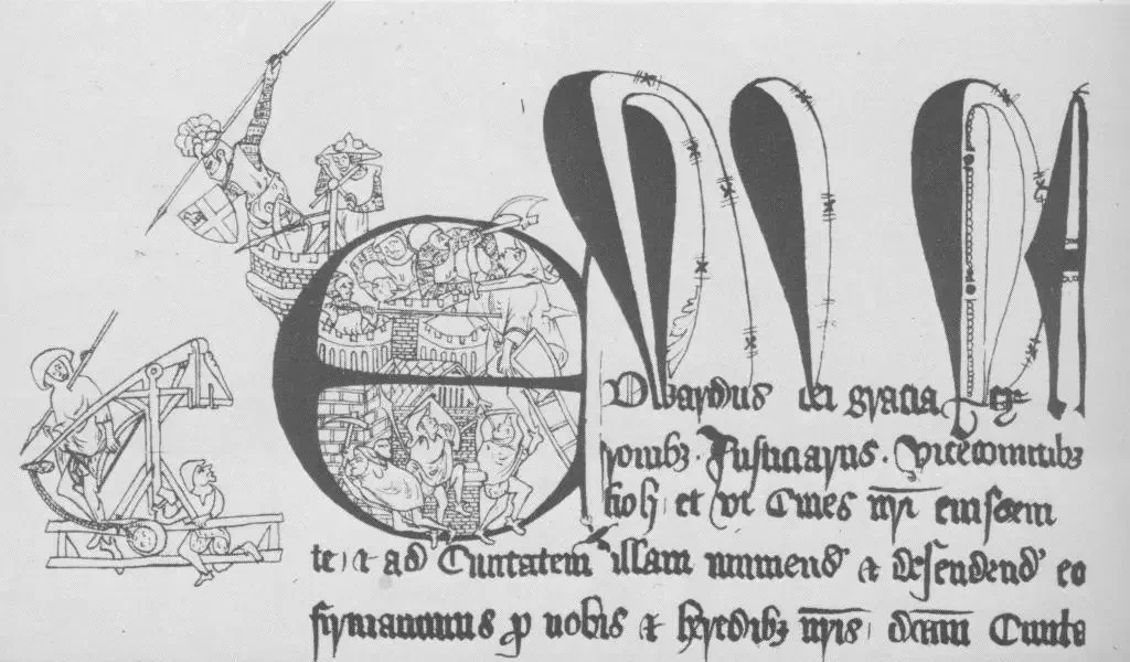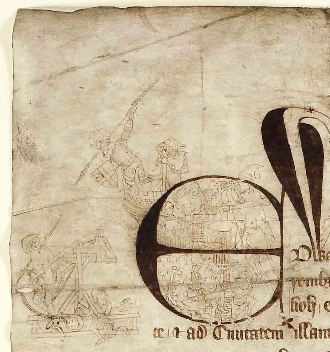Инициал с богатым декором иллюстрирует осаду Карлайла шотландцами в 1315 году. Шотландцы, конечно, изображены в невыгодном для себя свете. Но, тем не менее, это одно из самых ранних и точных изображений шотландского костюма, сделанное художником, который, вероятно, знал, что рисует. У шотландцев, или, точнее, у шотландцев-пограничников и галисийцев, нет доспехов. Они одеты в плащи, и, судя по всему, ходят босиком и носят большие мягкие шляпы, напоминающие «чепцы» более поздних веков. У них есть вполне современный требюше, и они умеют им пользоваться. Другой держит относительно короткий лук, а в группе сапёров есть человек с киркой. Последний воин на штурмовой лестнице вооружен боевым топором. Гарнизон Карлайла состоит из полностью экипированного воина с небольшим щитом с плоским верхом, возможно, в большом шлеме с забралом, кольчуге и, возможно, в латных рукавицах. Рядом с ним изображена фигура в кольчуге с квадратными плечами, что указывает на наличие подбоя, которая крутит лебедку, чтобы зарядить очень редко изображаемый осадный арбалет. Разрушительная сила этого арбалета видна по большой стреле или болту, пронзившему шотландского лучника. Среди других защитников цитадели есть человек с копьём и ещё один с фальчионом. Оригинал документа хранится в Камберлендском и Уэстморлендском антикварном и археологическом обществе