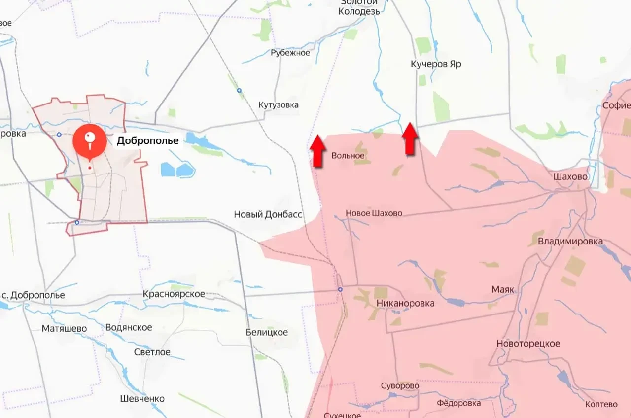 ВС РФ расширяют восточный фланг у Доброполья и достаточно широким фронтом возвращаются к Кучерову Яру и в перспективе - к Золотому Колодезю. Именно там некоторое время назад противник атаковал российские позиции. Тогда наши бойцы на выступе, получившем название Добропольского, оттянули на себя значительные силы врага, что в конечном итоге позволило завершить освобождение Покровска (Красноармейска) и Мирнограда (Димитрова).