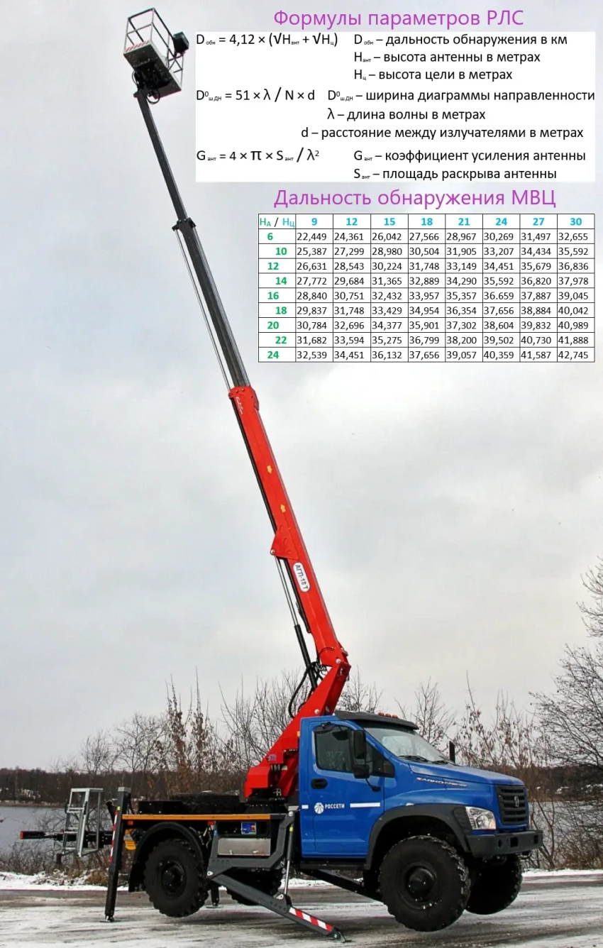 Прежде всего, для увеличения дальности обнаружения маловысотных целей откажемся от бронированного внедорожника в пользу серийного гражданского автомобиля повышенной проходимости с вышкой, которой доступна рабочая высота подъёма 22 метра.