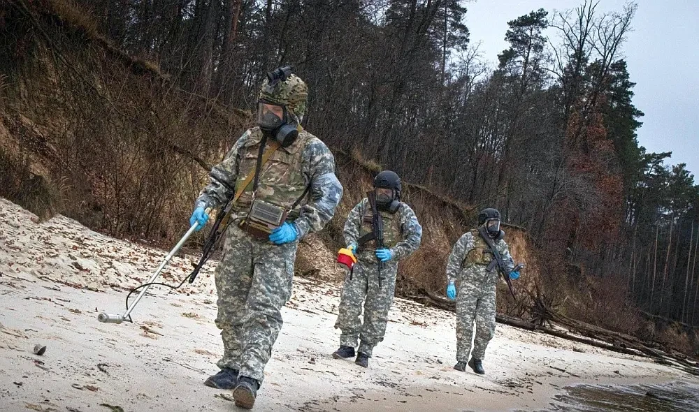 Начало января этого года. Одна из фотографий с тренировки войск радиохимической и биологической защиты ВСУ. Серьезная проверка дозиметрами загрязнений не только воздуха, но и водоемов, и почвы.