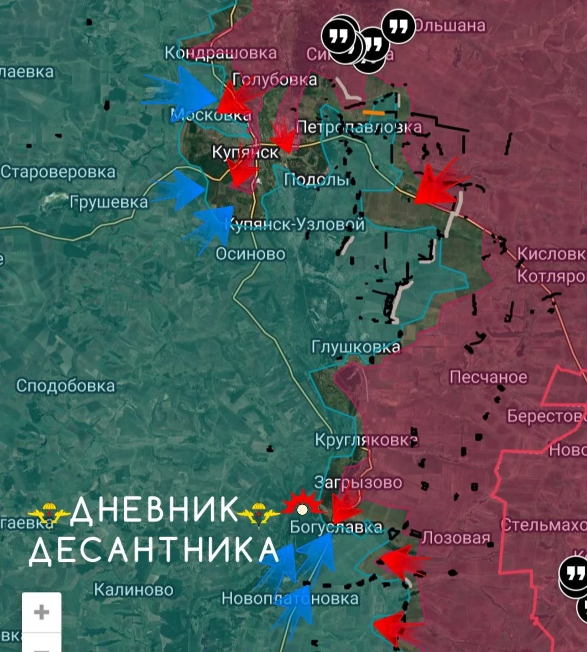 На Купянском направлении противник продолжают перебрасывать в город малые группы, мы отражаем атаки, взяли под контроль Тищенковку, также идёт зачистка Московки. На южном охвате противник концентрирует силы у Богуславки для контратаки.