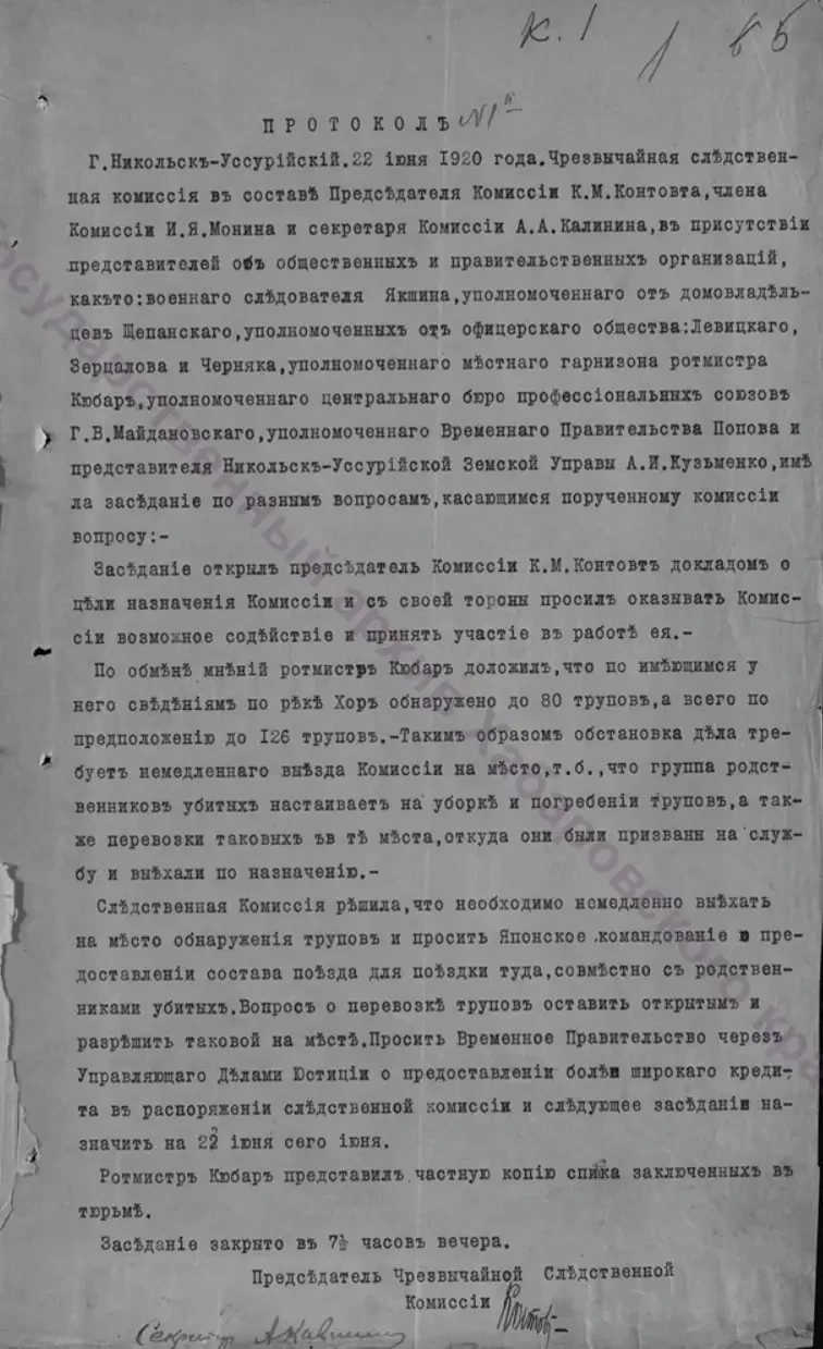 Следственная Комиссия решила, что необходимо немедленно выехать на место обнаружения трупов и просить Японское командование о предоставлении состава поезда для поездки туда, совместно с родственниками убитых. … Вопрос перевозке трупов оставить открытым и разрешить таковой на месте. Просить Временное Правительство через Управляющего Делами Юстиции о предоставлении более широкого кредита в распоряжение следственной комиссии и следующее заседание назначить на 23 июня сего июня.