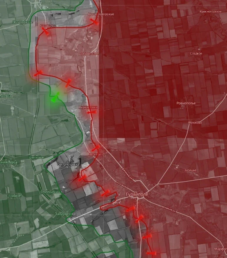 На Гуляйпольском направлении ВС РФ расширяют плацдарм западнее р. Гайчур. Прилуки и Еленоконстантиновку наши войска обошли с запада и фактически противник оказался в оперативном окружении. Со стороны Еленоконстантиновки наши части начали продвигаться в сторону Цветкового. За сутки ВС РФ отбили 4 контратаки ВСУ в районе Гуляйполя и 4 - у Косовцево. Выше по карте противник навязывает встречные бои в районе Братского. Идут бои в направлении Христофоровки и Терноватого с севера.