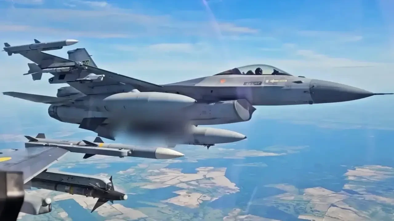 На одном из кадров, снятых с заднего сиденья F-16BM, видно, как ракета Sidewinder улетает, чтобы уничтожить беспилотник. Однако неясно, российский ли это беспилотник или цель во время тренировочного вылета. Сами понимаете, запросто может быть и кадр из записи тренировочного полета.
