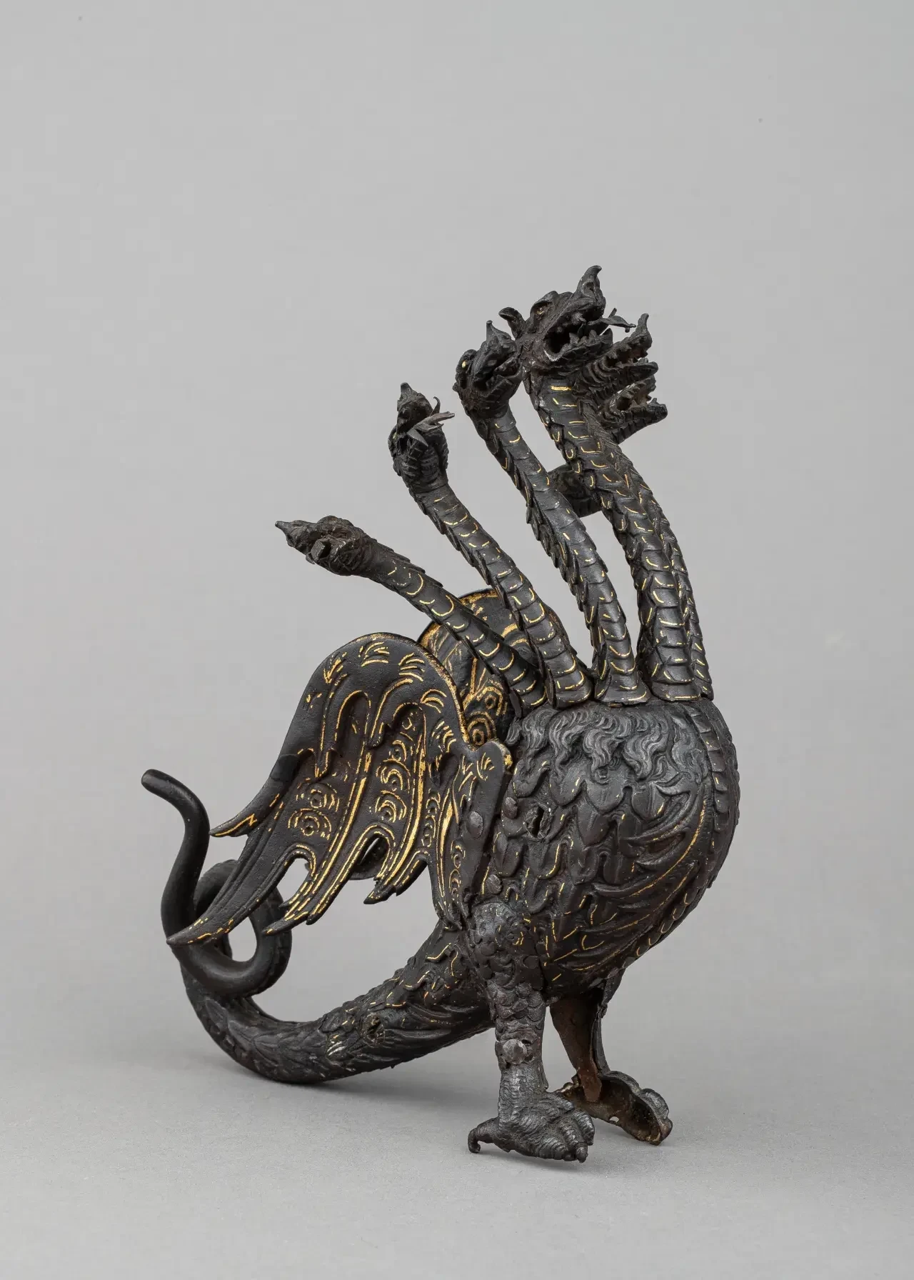 Нашлемное украшение шлема-бургонета Сфорца Паллавичино (1519–1585). По практическим соображениям большинство таких украшений изготавливалось из легких материалов, таких как загрунтованная и окрашенная кожа или дерево, но этот редкий экземпляр сделан из железа с золотым дамаскированием. Семиглавая Гидра была личным гербом Сфорца Паллавичино, солдата, служившего в императорской, папской и венецианской армиях. Эта фигура предназначалась для венчания богато украшенного тиснением и дамаскированием шлема (сейчас находится в Государственном Эрмитаже, Санкт-Петербург), на котором изображена та же эмблема Гидры. (Задняя часть хвоста, по-видимому, является неточной реставрацией). Вес 675 г. Метрополитен-музей, Нью-Йорк