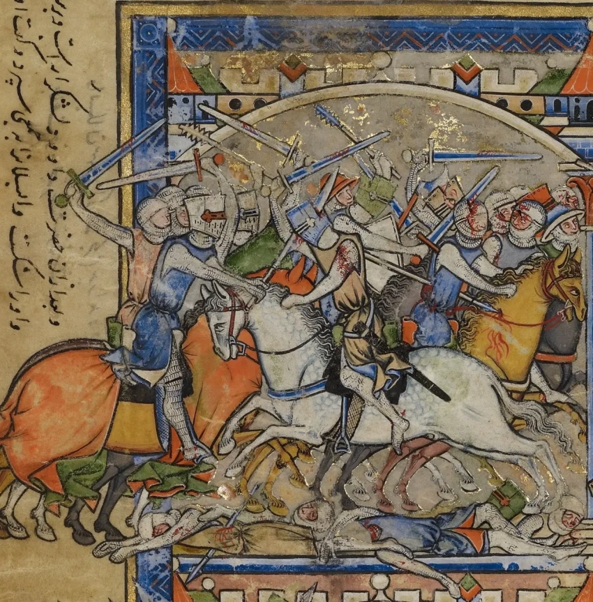 «Иоав преследует Саву до города Авел». Всадники в закрытых шлемах показаны без каких бы то ни было украшений, хотя шлем того, что в центре, и выкрашен в синий цвет. Миниатюра из «Библии Мациевского». Библиотека и музей Моргана, Нью-Йорк