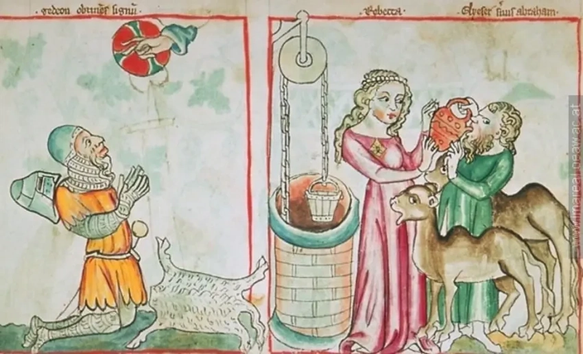 Свой тяжелый шлем рыцари часто носили за спиной на цепи. Иллюстрация из манускрипта «Speculum Humanae Salvationis», 1330-1340 г. («Зерцало человеческого спасения»). Библиотека Конгресса США