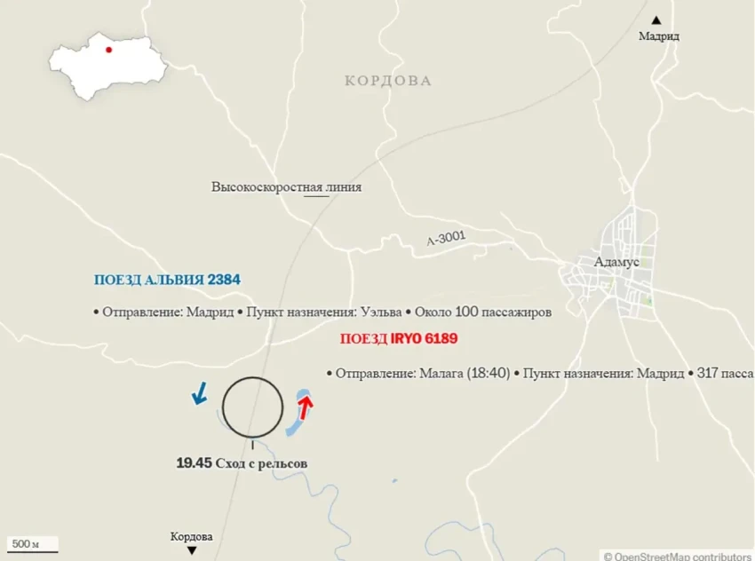 Речь идёт о схождении с рельсов пассажирского поезда Iriyo Малага-Мадрид, в котором было более 300 пассажиров. Вагоны поезда, по последним данным, при схождении врезались в другой поезд (Alvia), который двигался на скорости около 200 км/ч в противоположном направлении (Мадрид-Уэльва) по соседнему пути, и в результате столкновения составы сорвались с 4-метровой насыпи, доступ к которой затруднён. В скоростном поезде Alvia было около сотни пассажиров.