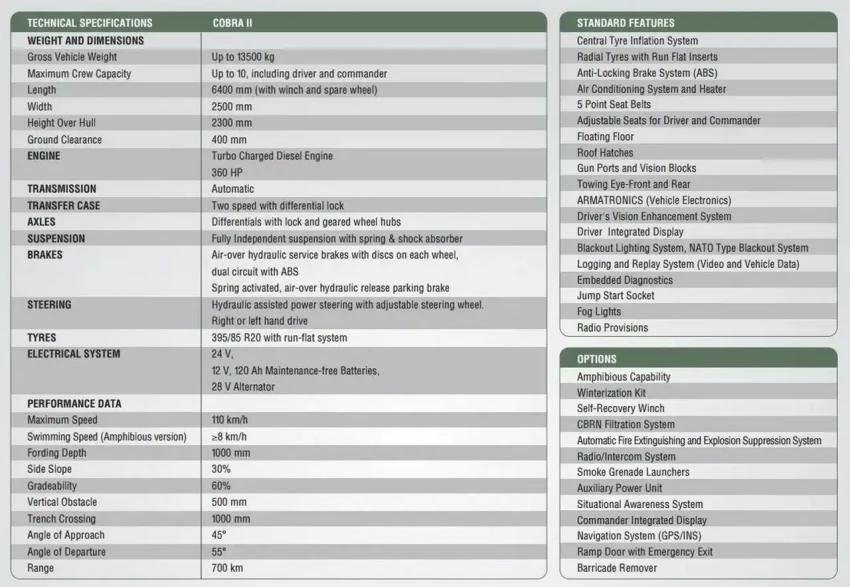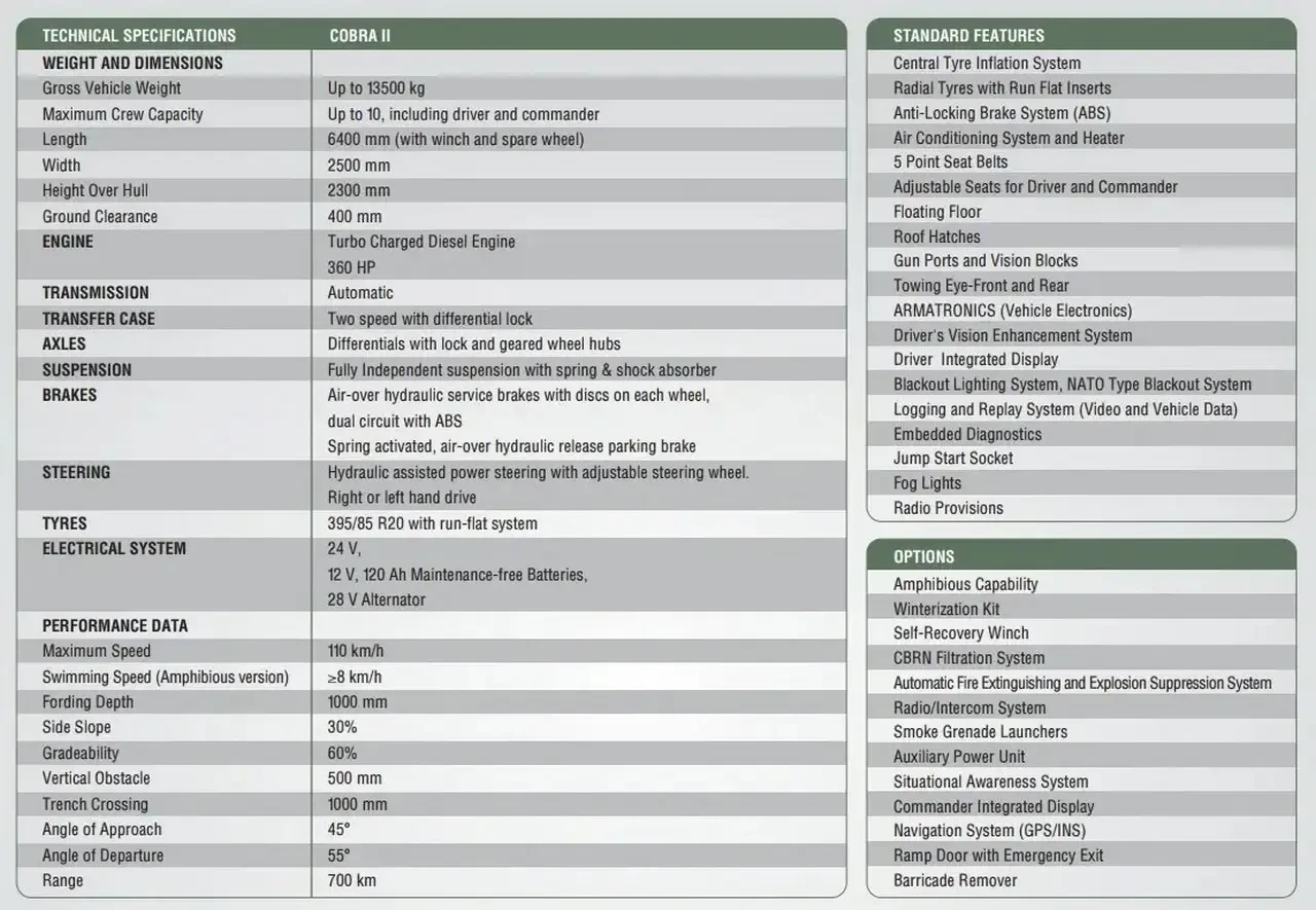 Cobra II представляет собой модульную платформу с превосходными ТТХ – выдающейся мобильностью, высокой баллистической и противоминной защитой, увеличенной грузоподъёмностью и большим внутренним объёмом.