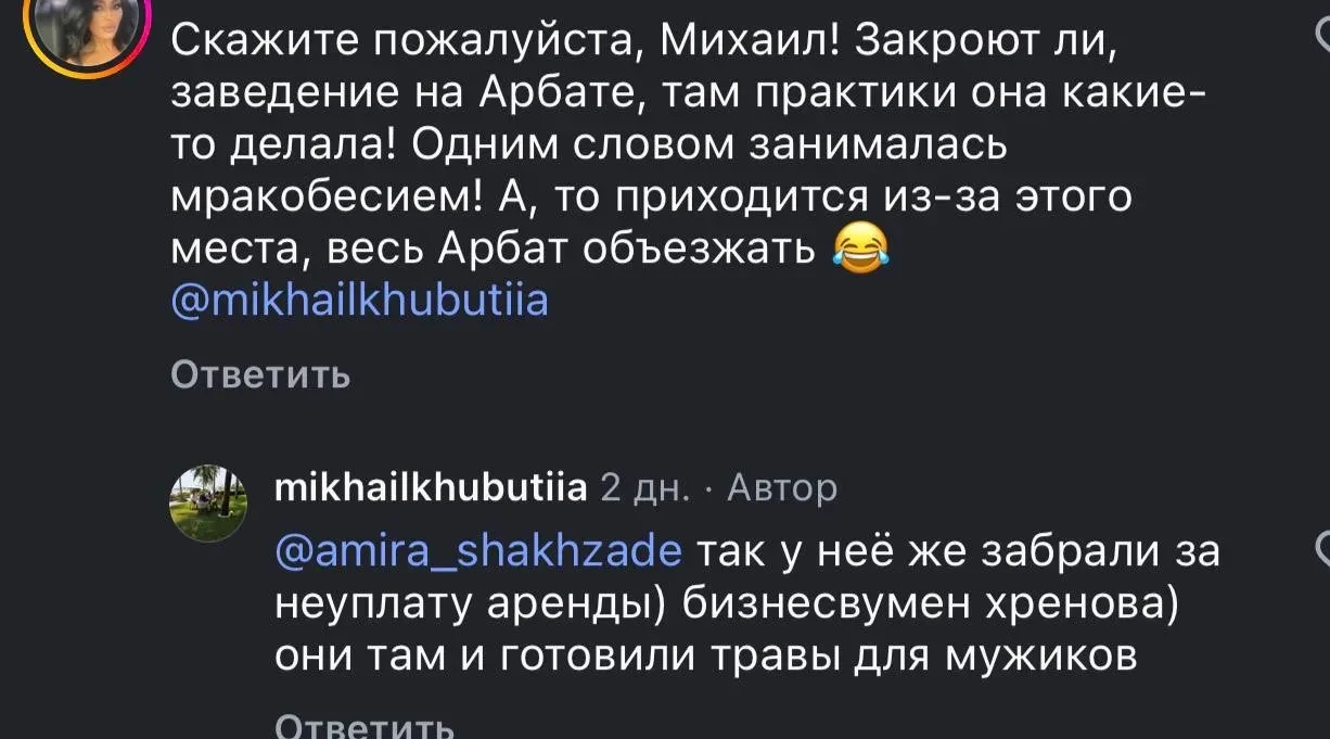 https://t.me/and_malakhov/1865В сети обратили внимание на комментарии под анонсом выпуска на странице Хубутии: в большинстве из них пользователи оправдывают экс-чиновника, тогда как в сторону Ван звучит критика. При этом сам Хубутия активно участвует в обсуждении, используя обсценную лексику. В комментариях также появилась законная жена экс-чиновника Екатерина Джанашия (пользователь ekaterina_dzhanashiya*), которая также высказалась о скандале.