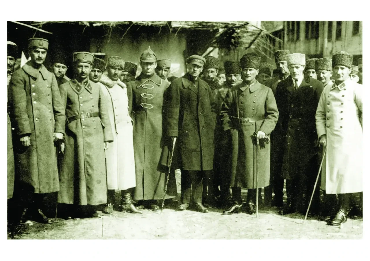 Мустафа Кемаль, Исмет-паша (Иненю), полпред РСФСР С. Аралов и военный атташе К. Звонарев в окрестностях Коньи в период подготовки к генеральному наступлению турецких войск против греческой армии. 23 марта 1922 г.