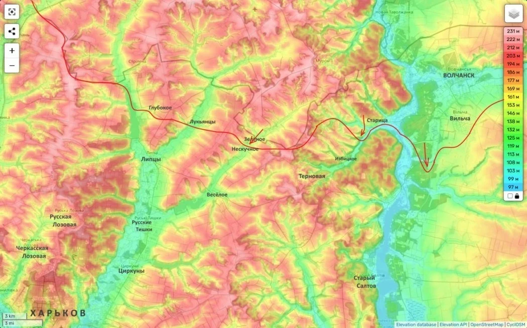 И если посмотреть на карту, то Зелёное находится немного западнее. При этом ключевыми логистическими узлами здесь являются села Терновая (до нее от наших передовых позиций 1 км) и Весёлое (до него около 3-4 км). Заняв которые можно сильно осложнить жизнь для противника на Харьковском направлении.