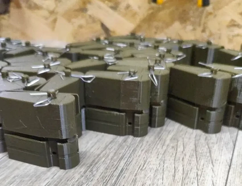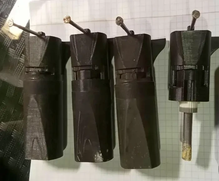 Это фугасная мина нажимного действия весом до 100 грамм, предназначена для кассетного минирования местности. Один БПЛА может нести до 20 таких мин одномоментно. Корпус печатается на 3D-принтере, затем окрашивается для максимального сходства с устройствами электронных сигарет. Пластик корпуса очень тонкий, даже при легком нажатии лопается и приводит к срабатыванию заряда. Предохранитель (чека) выдергивается при сбросе.