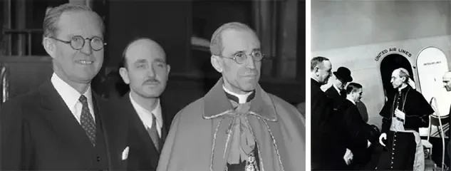 Авиационный вояж в октябре-ноябре 1936 года кардинала Эудженио Пачелли (будущий Папа Пий XII) по Соединенным Штатам, за что его прозвали «Летающим кардиналом». На фото слева: встреча кардинала Эудженио Пачелли с Джозефом Кеннеди (бизнесменом, будущим послом и отцом будущего президента Джона Кеннеди) во время своей дипломатической миссии в Америке в 1936 году